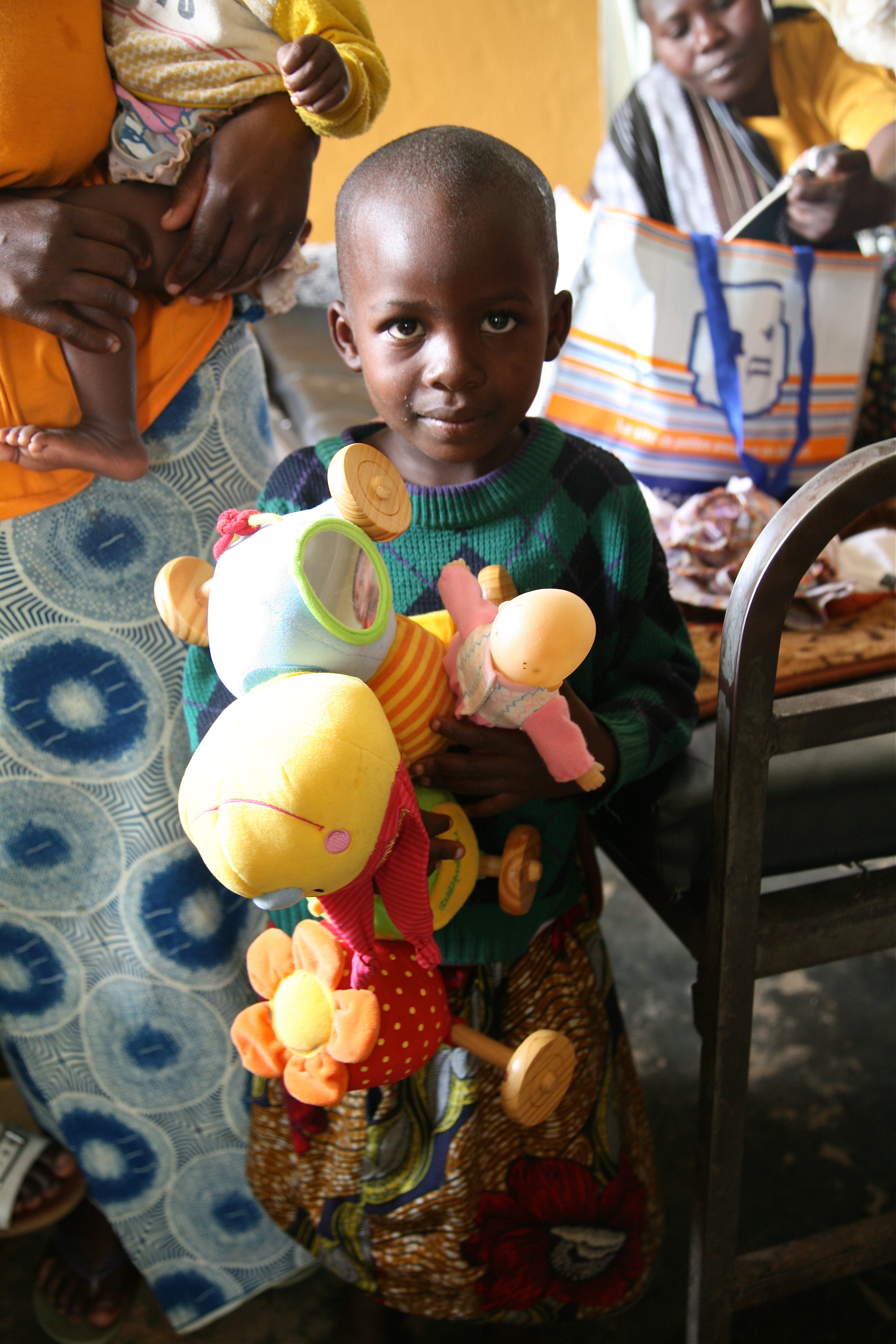 Nous nous rendons au dispensaire de Ruhina, à Kiyumba (Nyabikenke) pour y donner quelques médicaments, des jouets aux enfants hospitalisés, des vêtements, des parapluies et articles sanitaires aux jeunes mères qui vont ou viennent d’accoucher. Chaque enfant peut choisir sa poupée. Ici, comme ailleurs au Rwanda, les poupées reçoivent un accueil incroyable ! Même dans la cambrousse, ce petit dispensaire reçoit les traitements adaptés et les malades de la malaria et du sida se font de plus en plus rares. La salle d’accouchement a été un peu modernisée mais reste rudimentaire par rapport à nos hôpitaux confortables !