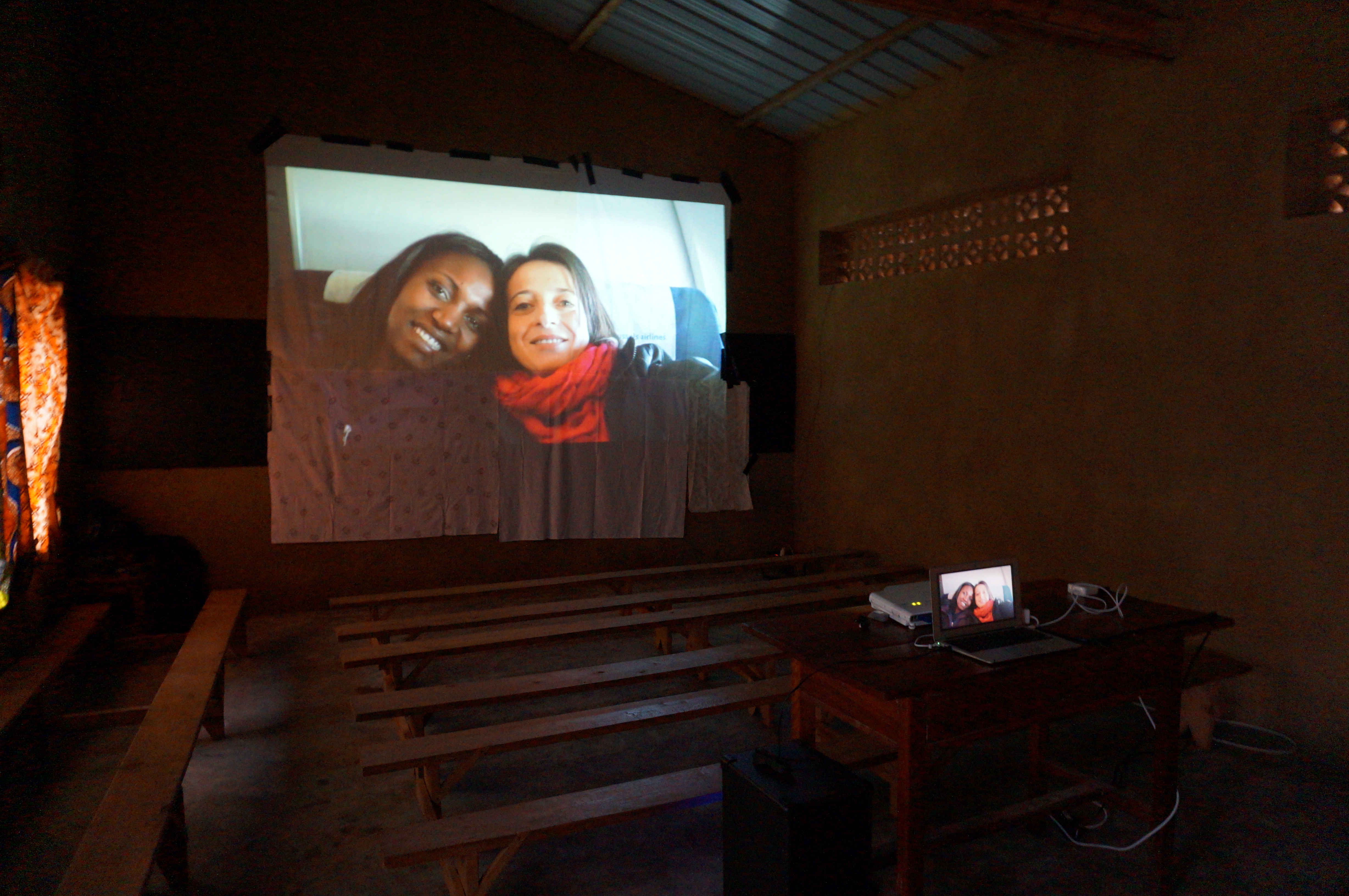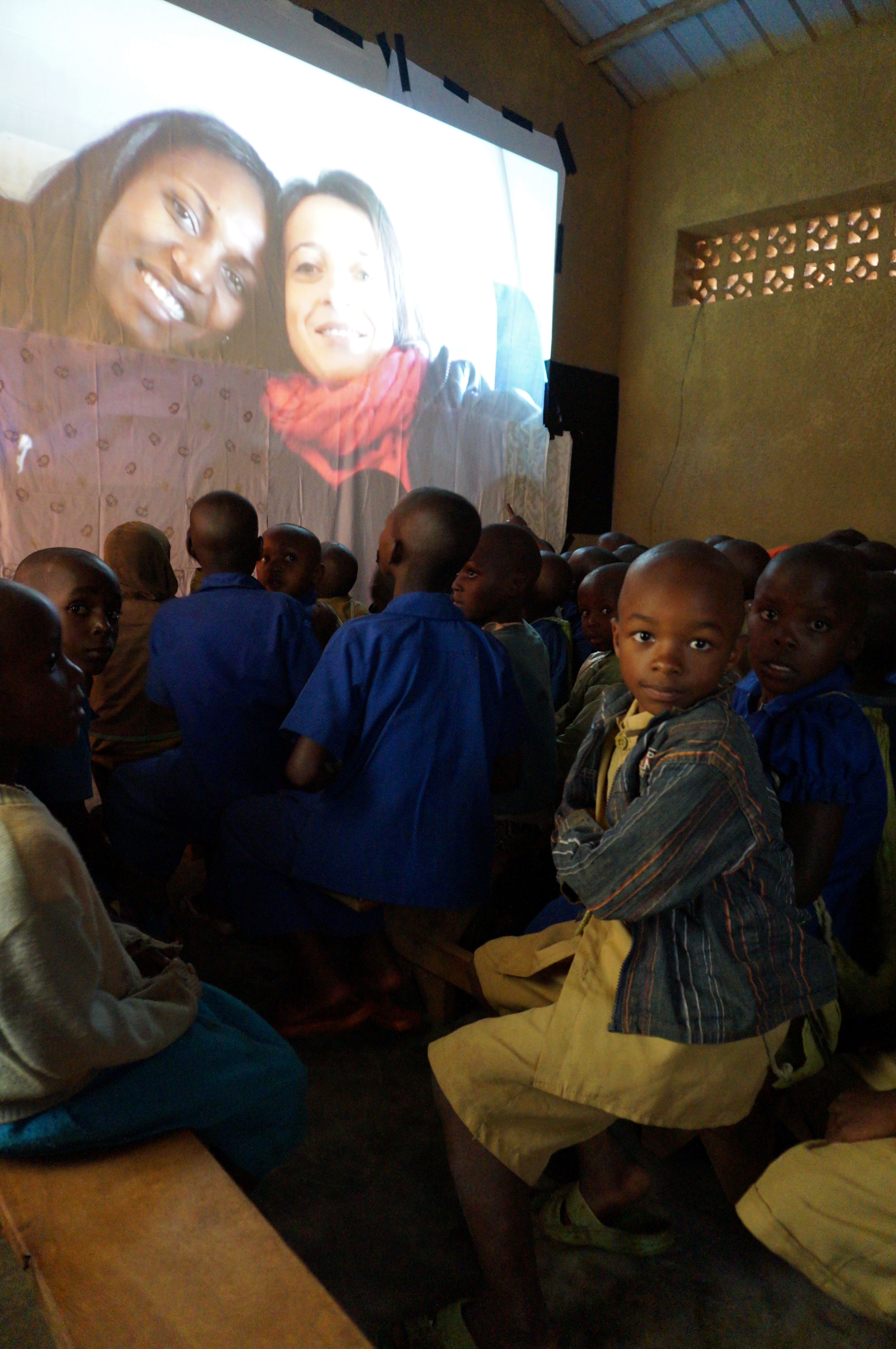 Après un accueil exceptionnel, accompagné de danses enivrantes et des chants rythmés des enfants, nous improvisons un écran de cinéma dans le bâtiment fraichement rénové par nos soins sur lequel nous allons projeter la vidéo que nous avions tournée en 2012. Pour tous ces enfants, c’est la toute première fois qu’ils vont voir leur image. Ils n’ont ni photo, ni miroir, ni vitre pour voir leur reflet. Même un rétroviseur de voiture semble leur renvoyer une image étrangère. Bouches bées et fous rires garantis !