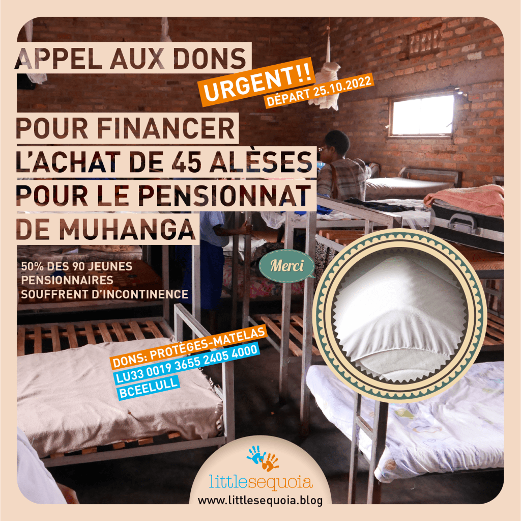Nous faisons également un appel au dons pour financer l’achat de 45 protèges-matelas (alèses imperméables) pour l’école primaire / pensionnat « La Miséricorde » (Muhanga District Nyamabuye sector). Il s’agit d’une école-pensionnat où nous avions placé nos deux jeunes enfants sourds-muets afin qu’ils apprennent le langage des signes.